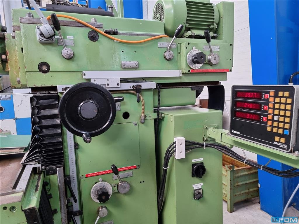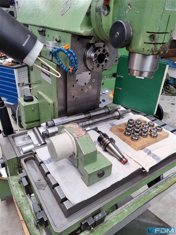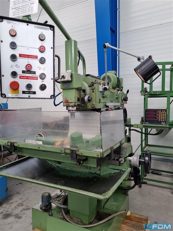 x-travel: 620 mm y-travel: 420 mm z-travel: 400 mm digital readout: 3 Achsen HEIDENHAIN spindle taper ISO: 40 DIN 69871A spindle turning speed range: 50 - 4000 U/min table-size: 800 x 400 mm table load: 400 kg feeds -stepless-: max. 2000 mm/min rapid traverse: 5 / 4 m/min power capacity - milling spindle: (S1) 10,5 kW quill stroke: 80 mm coolant: voltage: 400 V total power requirement: 17,5 kW weight of the machine ca.: 1,9 t dimensions of the machine ca.: 2,00 x 2,76 x 2,05 m - Serial-No.: 90395 - Digital display HEIDENHAIN ND780 - electr. handwheel - mechanical handwheels - stepless speed control - stepless feed drives - horizontal milling spindle - coolant device The data for this ad was created with ModulMWS - the software solution of LogoTech oHG.