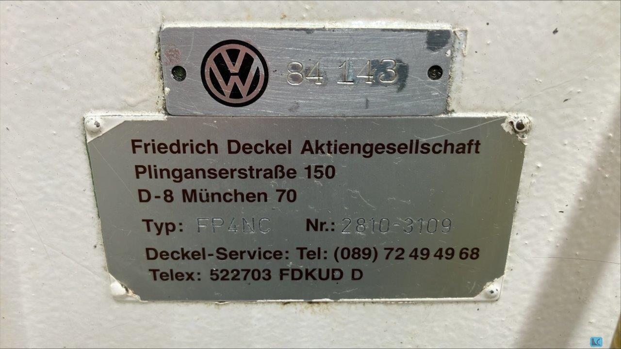 DECKEL FP4 NC Fraesmaschine Dialog 4 Diálogo 4 control, rango de trabajo 560 x 500 x 450 mm, carrera de pinole 80 mm, 18 velocidades de husillo 31.5 -6300 min, cabezal plegable, portaherramientas SK 40, velocidad de alimentación 1-4000 mm/ min, arrastre rápido 6000 mm / min, carga de mesa 800 kg, peso 2070 kg, valor total de conexión 16 kVA.