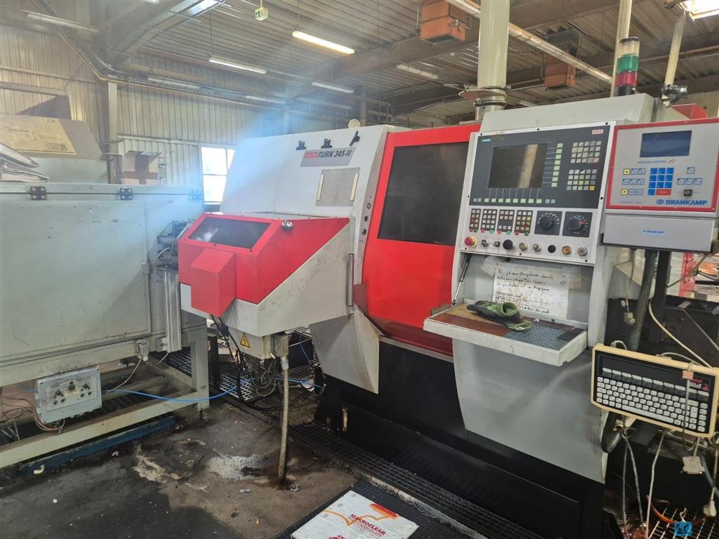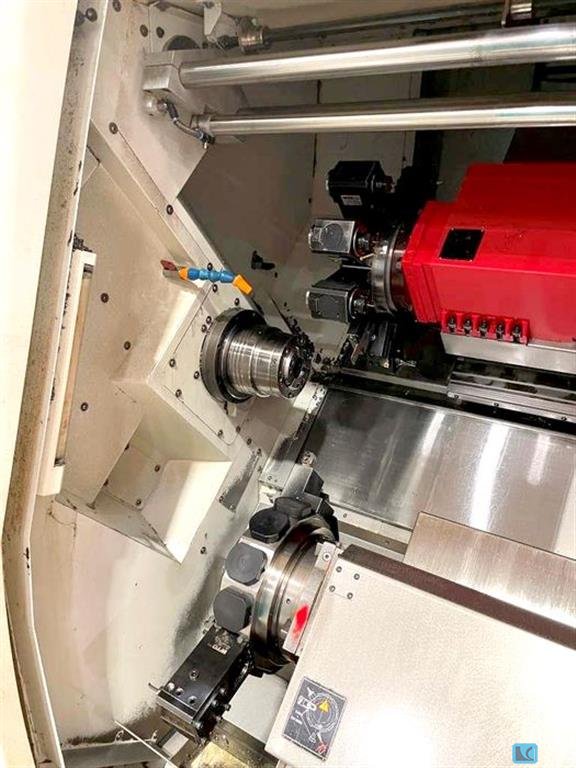 Torno CNC de doble torreta tipo husillo doble Unidad de control: Siemens 840 D Diámetro de giro: 140 mm Longitud de giro: 480 mm Distancia husillo principal - subhusillo: 720 mm Diámetro del orificio del husillo principal: 42 mm Tipo de torreta: 12 estaciones con portaherramientas VDI25
