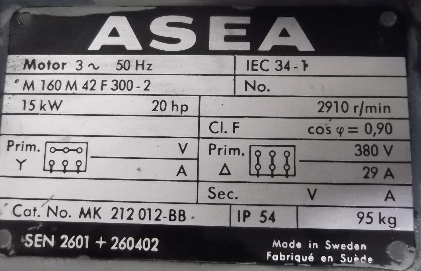 Electric motor 15 kW 2910 Rpm ASEA M160M42F300-2