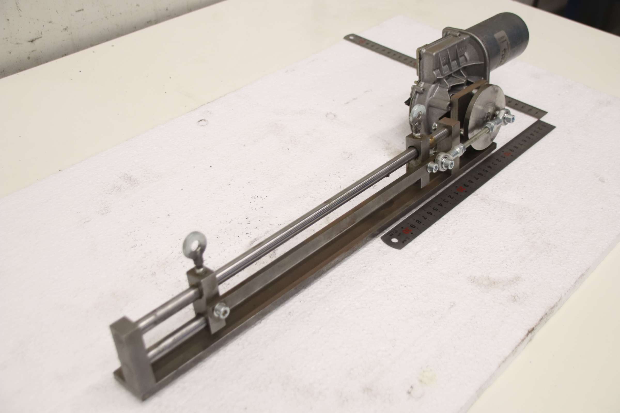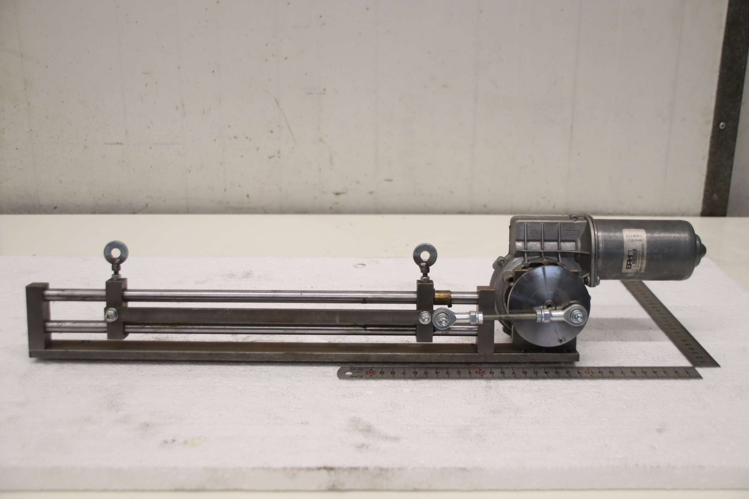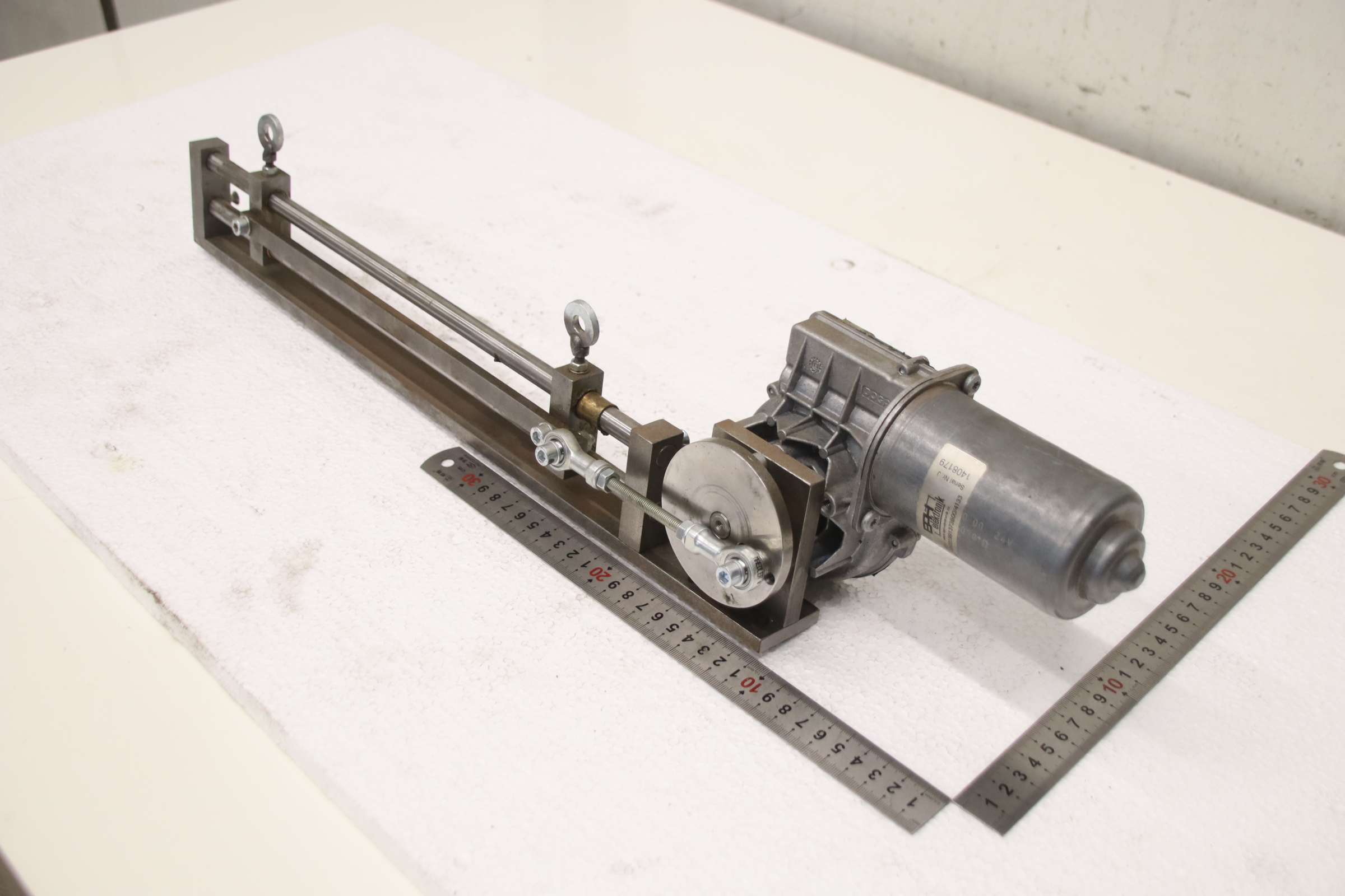 Guide rail, servo motor, electric motor, DC motor, DC geared motor -Servo drive: with linear guide -Servomotor: EPH elektronik type DO31991373B00/4133 -Voltage: 24 V -Travel distance: 47 mm -Hole spacing: 285 mm -Dimensions: 640/110/H140 mm -Total: 4.9 ...