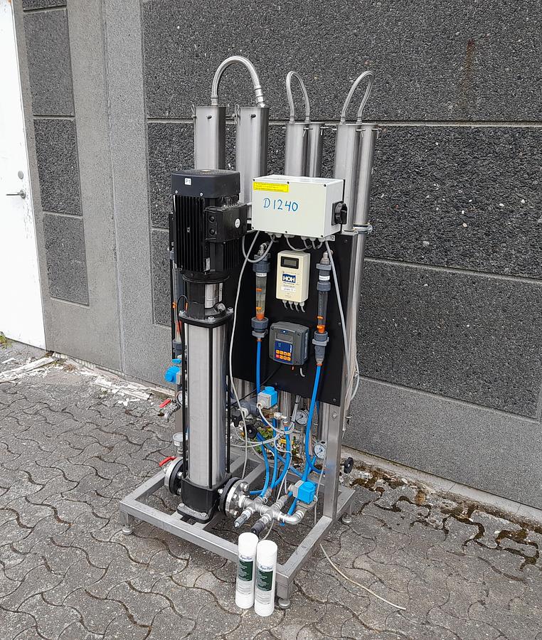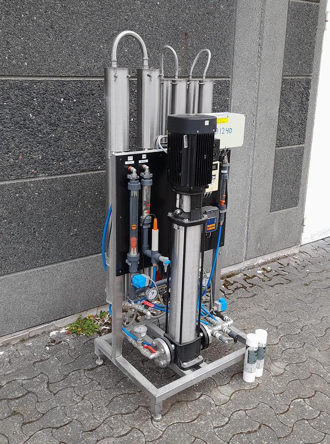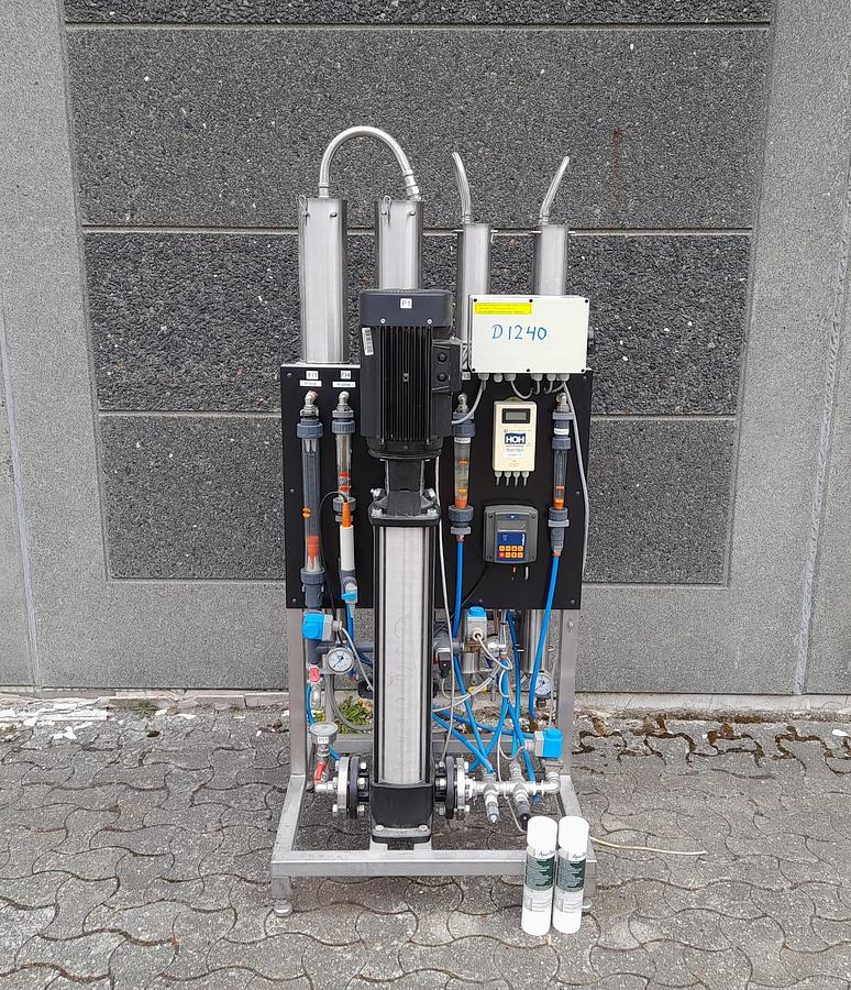 Stock number: D1240, Material: Stainless steel AISI 304, In stock: Yes, Amount in stock: 1 pc., Item: RO plant, Standing: In stainless rack, Dimensions: L 720 x W 650 x H 1700 mm., Capacity: 500 l/h, Manufacturer: HOH Best Water Technology, Type: Duo 2020, Model: RO 2-Pass 500, Documentation: Yes