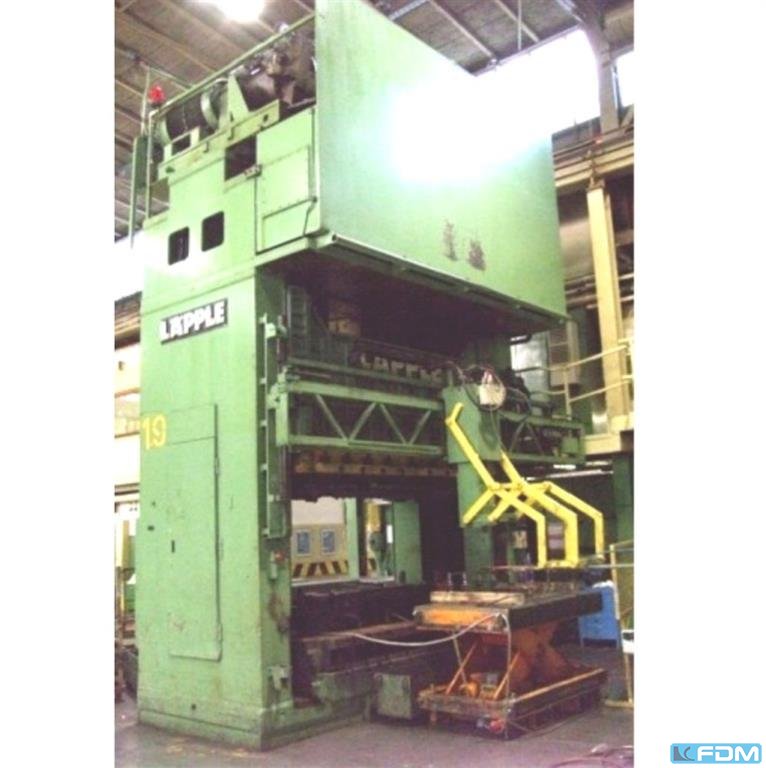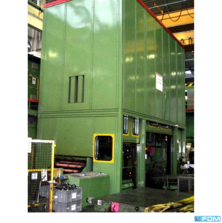 pressure:2000 tdistance between columns:975 mmstroke:400 mmdistance table/ram, max. stroke up, adjustment up:1000 mmtable surface area:1015 x 1050 mmtable height over floor:800 mmcapacity of ejector in table:6,3 tejector stroke in table:100 mmcapacity of ejector in ram:65 tejector stroke in ram:100 mmram surface:975 x 1050 mmreturn capacity:150 tspeed down:235 mm/sspeed up:250 mm/sworking speed:5 - 20 mm/soil volume:4000 lheight over floor:3,65 mheight beneath floor:3,75 mpower requirement:194,0 kWweight:105,0 tdimensions (WxDxH):5,0 x 6,5 x 7,4 m