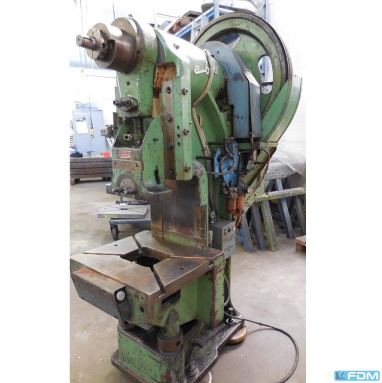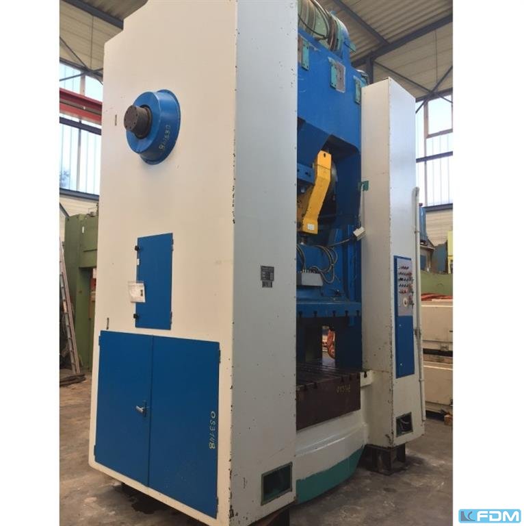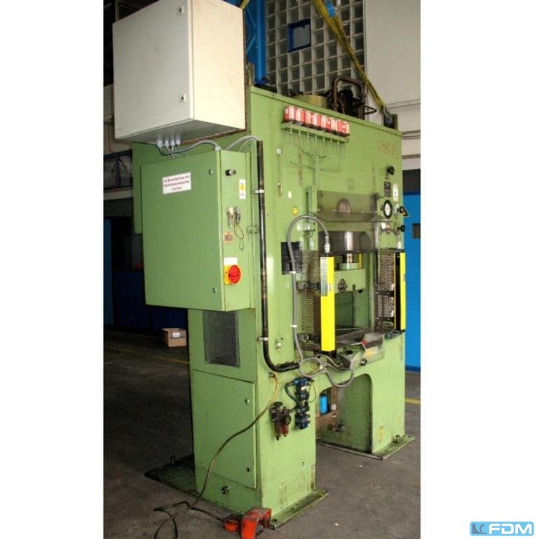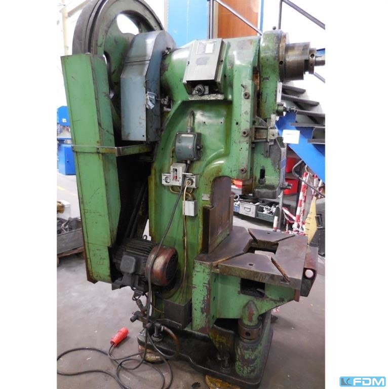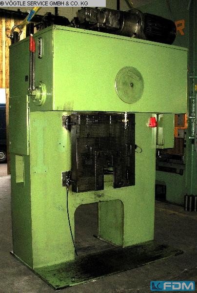pressure:100 tthroat:350 mmstroke:6 - 100 mmno. of strokes:60 /mindistance table/ram, max. stroke up, adjustment up:400 mmtable surface area:850 x 700 mmhole in the table:470 x 150 mmtable height over floor:855 mmram surface:450 x 300 mmram adjustment:80 mmpower requirement:7,5 kWweight:5,0 tdimensions (WxDxH):1,5 x 2,3 x 2,6 mGerman Safety: permitted for manual loading:UVV 11.062 - VBG 7n5.1 clutch:pneumatic overload protection in ram:mechanical