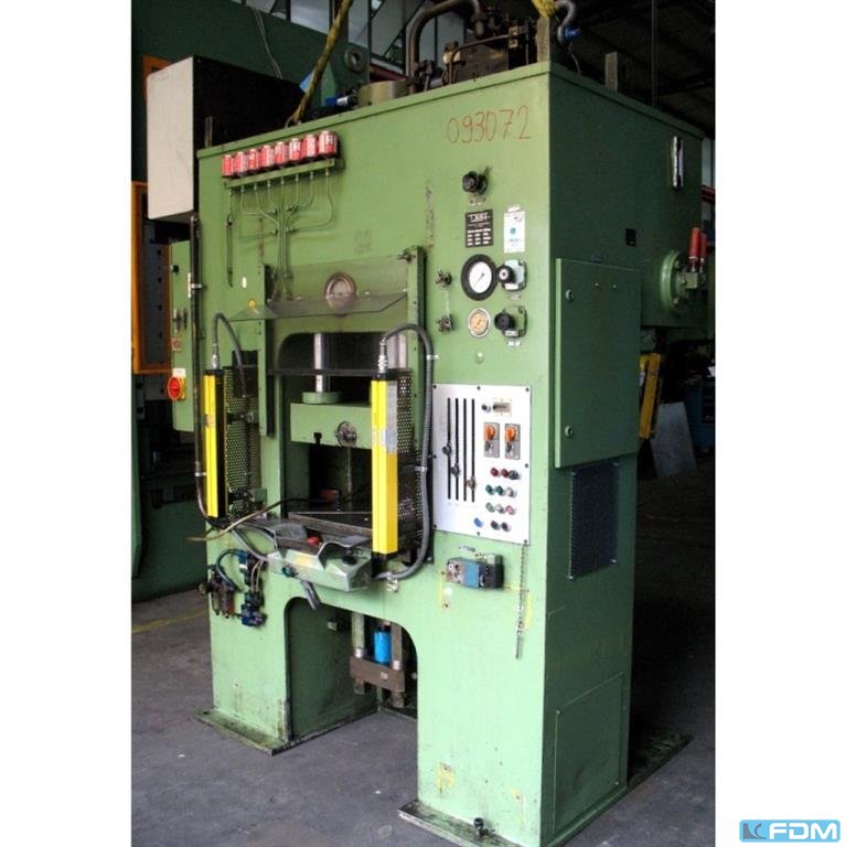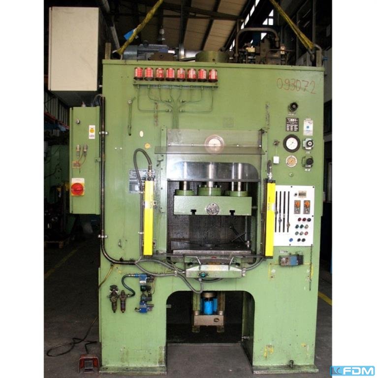 pressure:100 tdistance between columns:1000 mmstroke:300 mmdistance table/ram, max. stroke up, adjustment up:650 mmtable surface area:980 x 700 mmpressure of drawing cushion in table:4 x 10 / 1 x 20 tstroke of drawing cushion in table:180 mmtable height over floor:800 mmside window:400 mmram surface:1000 x 700 mmspeed down:500 mm/sspeed up:450 mm/sworking speed:60 mm/spower requirement:40,0 kWdimensions (WxDxH):1,5 x 1,4 x 4,5 mGerman Safety: permitted for manual loading:UVV 11.064 - VBG 7n5.2 drawing cushion in table:4 x 10 t + 1 x 20 t, getrennt einschaltbar foundation pit:nicht erforderlich
