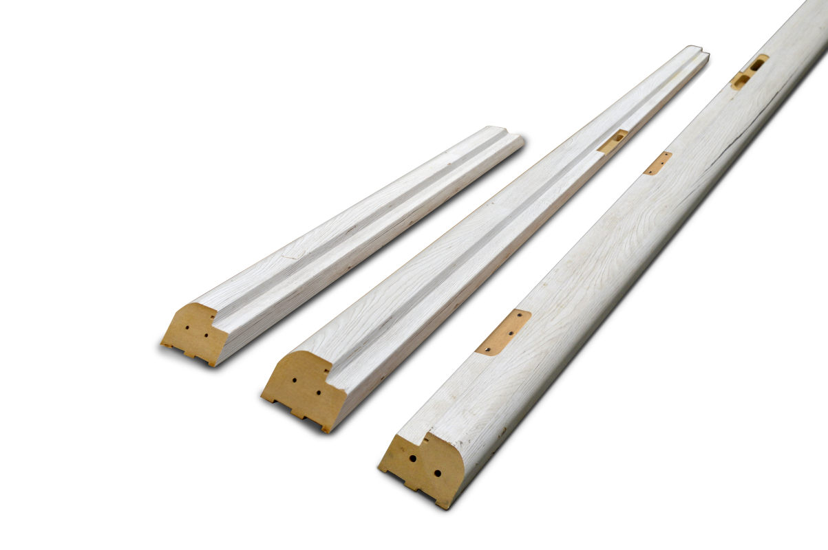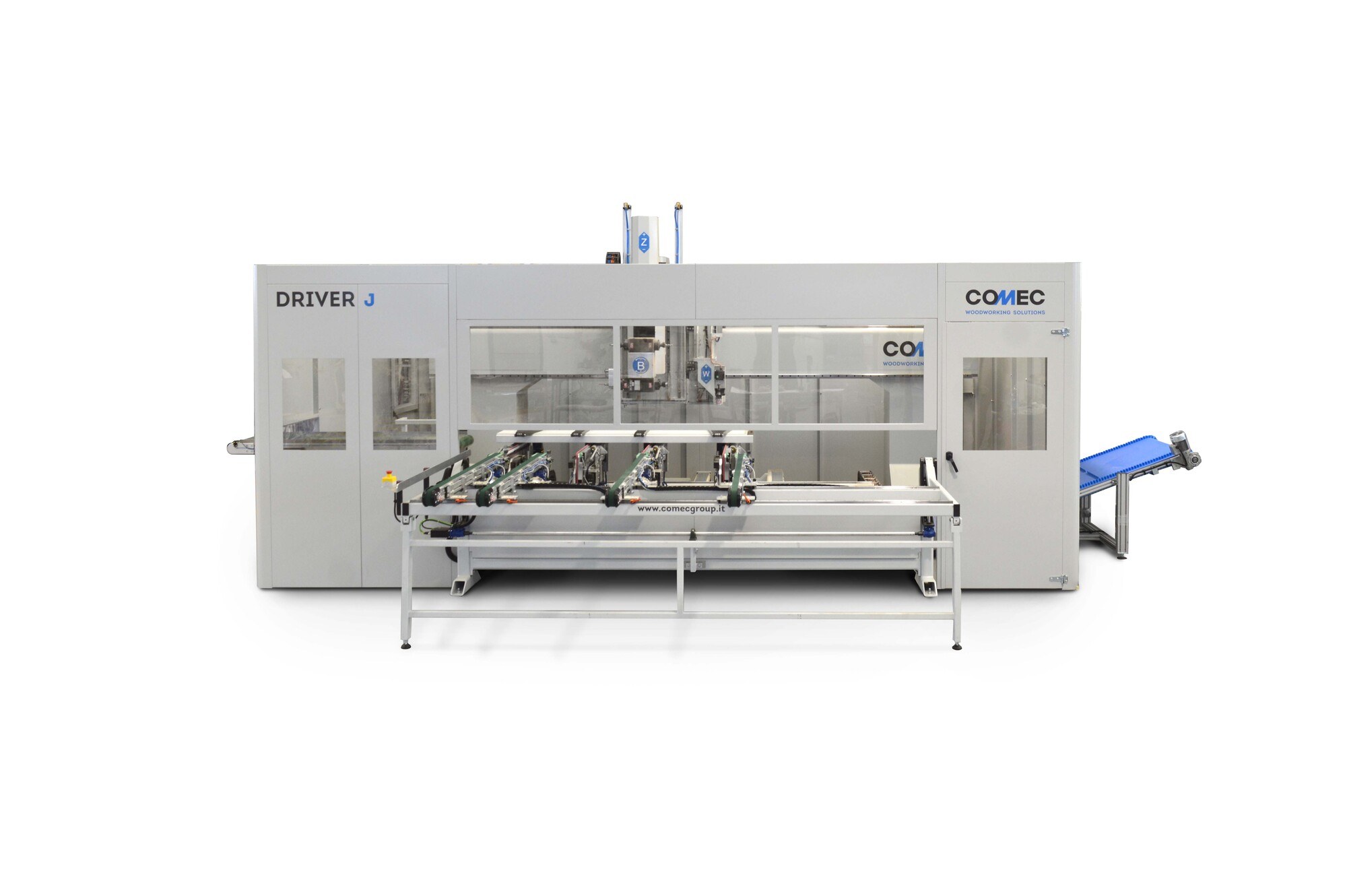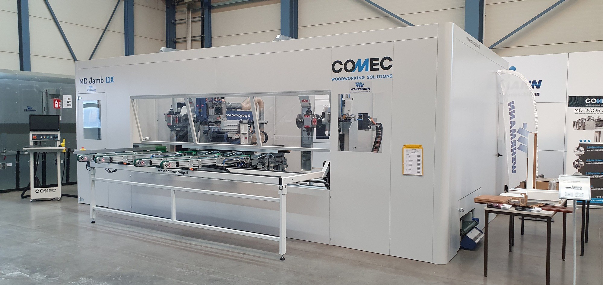 New CNC Maschine Brand: Comec type: MD JAMB CNC machining center for complete machining of a wide range of door frames. 3 machining supports for cutting to length on miters, milling for corner connectors and door lock panels. A complete door frame element with decorative cladding and rebate cladding is machined in one set-up. A complete frame can thus be machined in approx. 2.5 - 3 min. Machining equipment can be individually adapted to the customers requirements.
