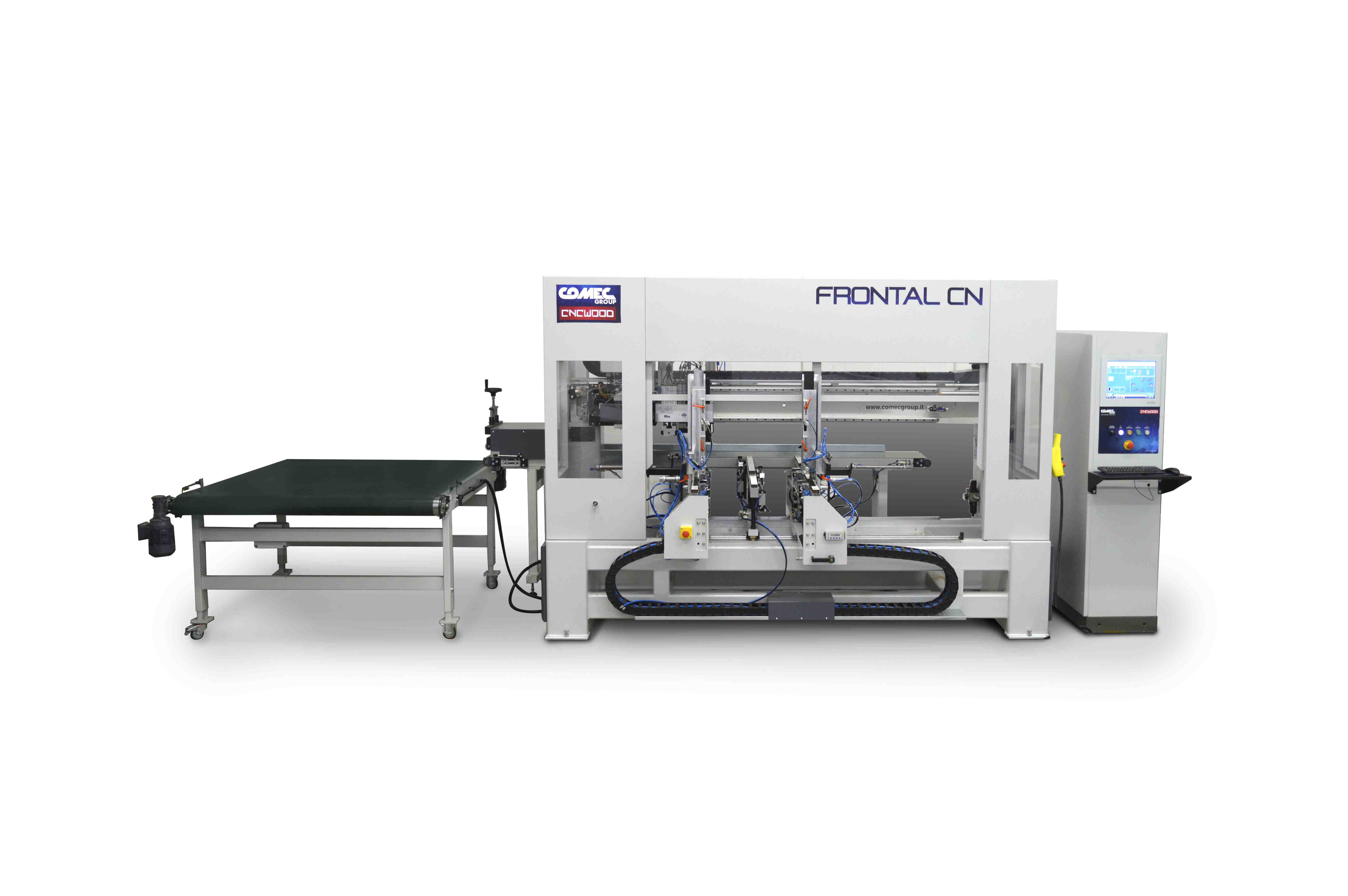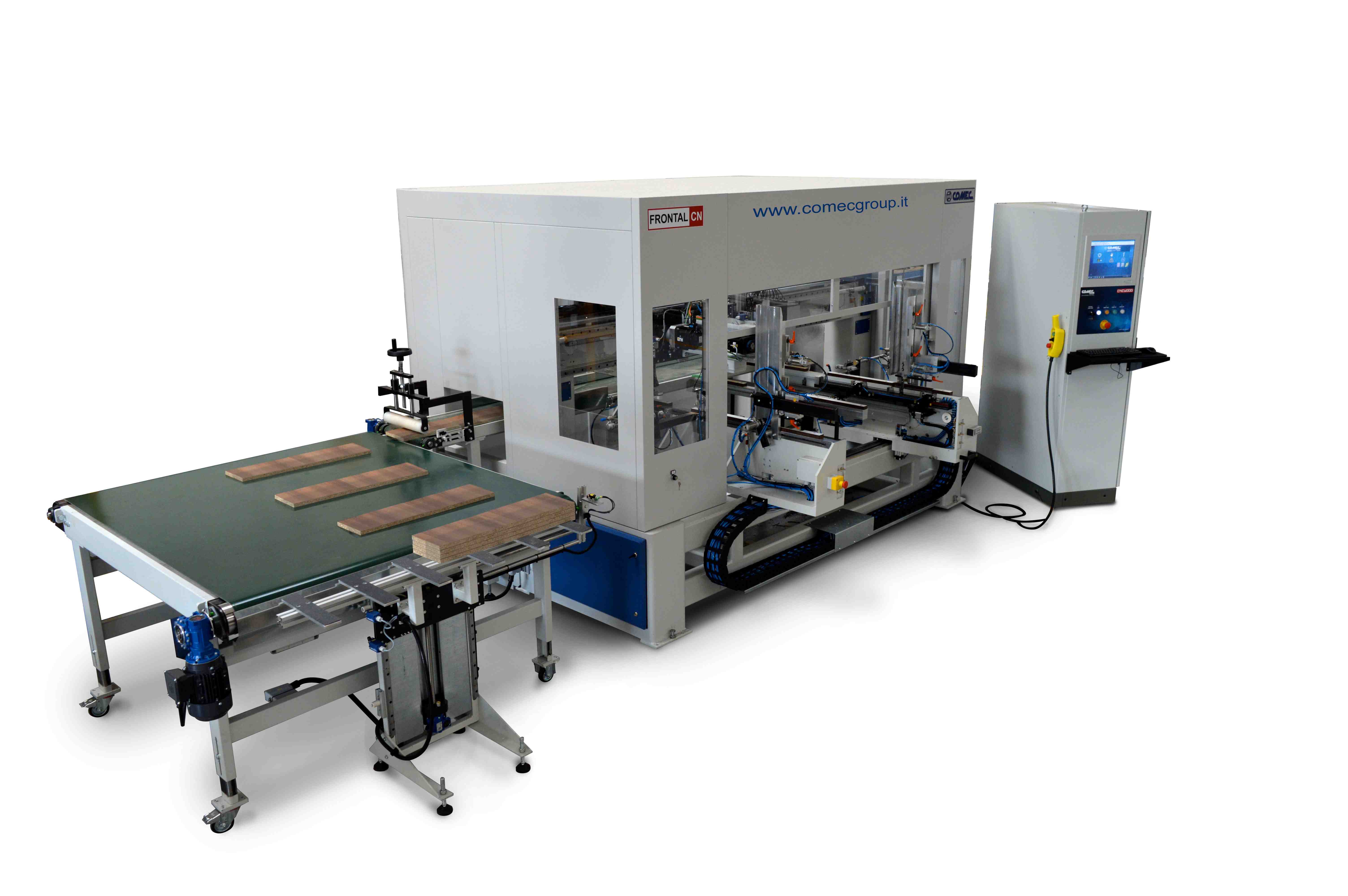 Drilling- cutting machine Brand: Comec Type: Frontal 2 CN New machine Drawer parts machining in compact design Fast set-up for the smallest possible batch sizes thanks to CNC technology - Perfect machining The FRONTAL CN is ideally equipped for the machining of drawer parts and can be optionally equipped with drilling units from above, but also laterally, e.g. for drawer side parts. The drilling units at the top are suspended at the front of the upper beam so that a grooving saw unit can be mounted at the rear, for example, for drawing in top grooves. The machines can be equipped either with manual feeding or with automatic feeding magazine, so that the machines can work in continuous operation. For larger batch sizes, the FRONTAL is also available as a BASIC machine with conventional control.