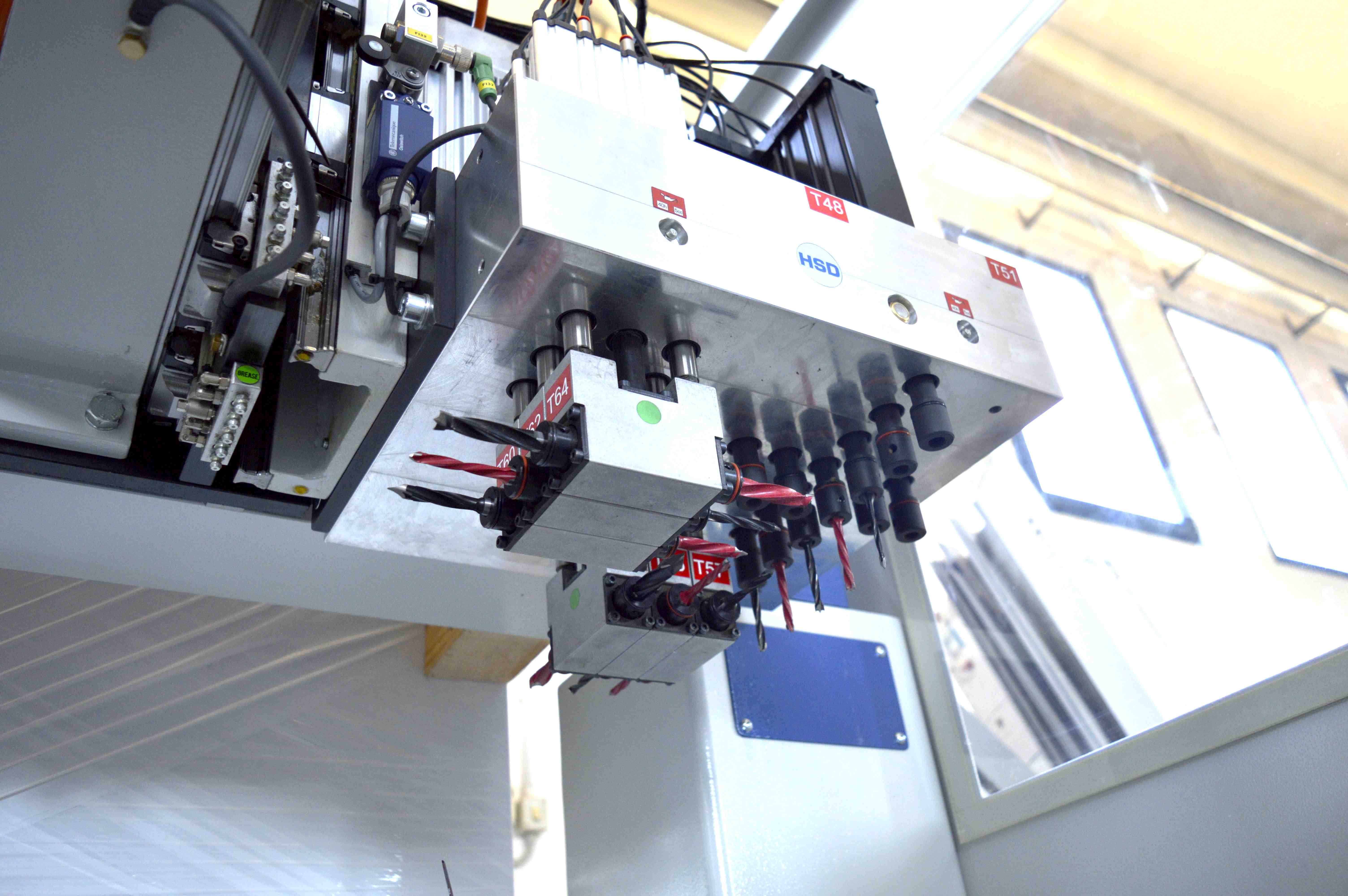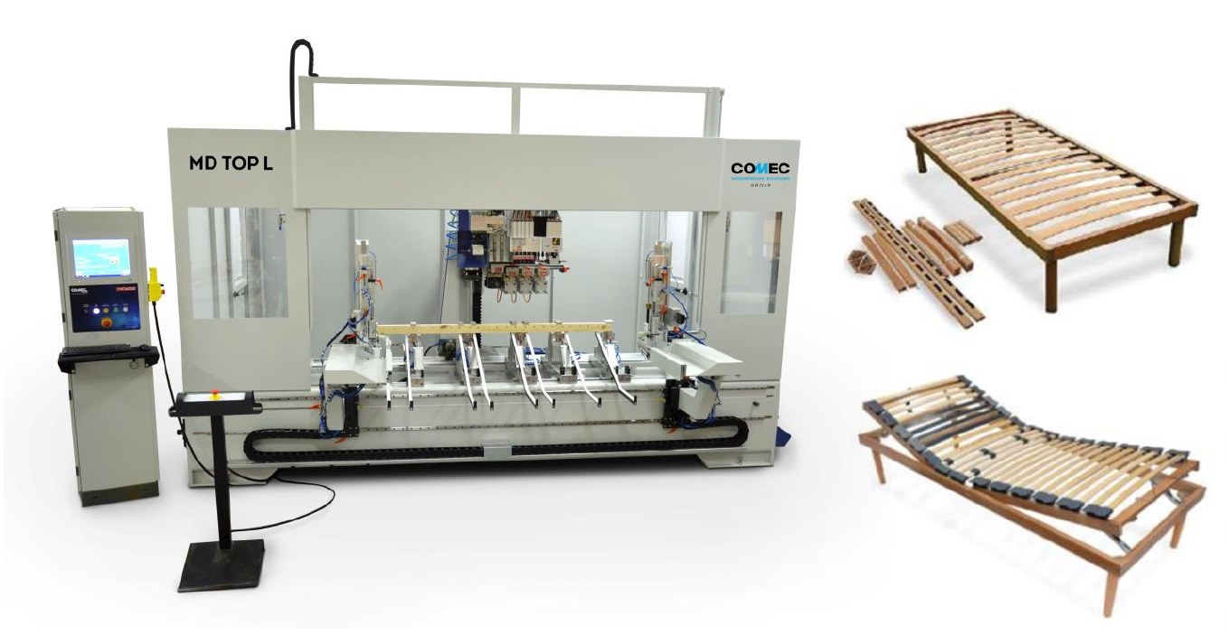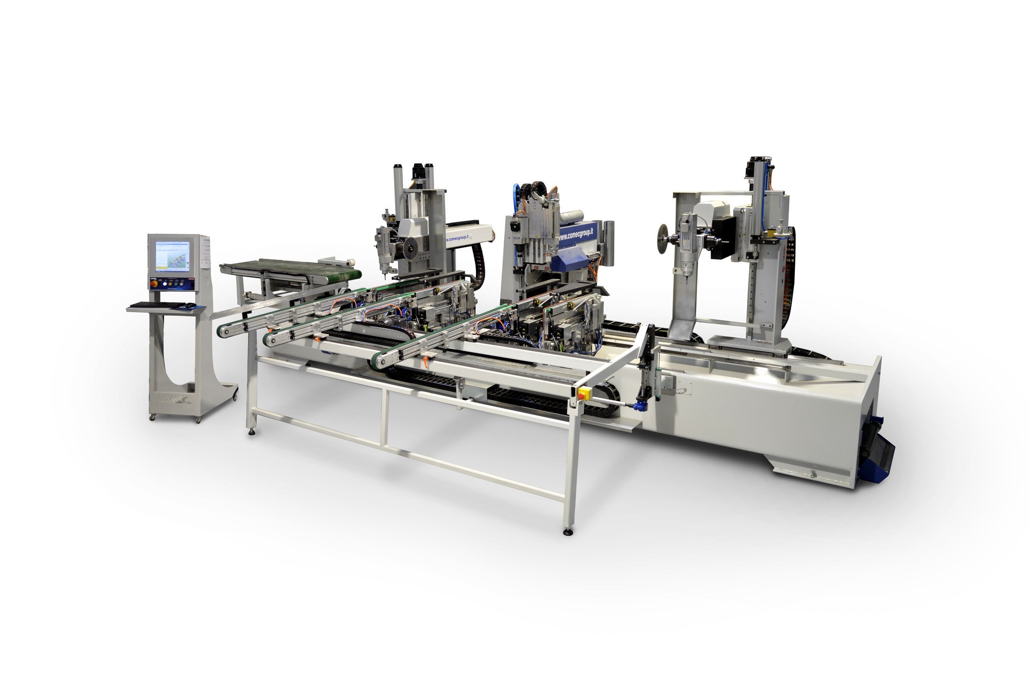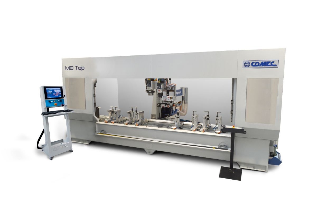 CNC - processing center Brand: COMEC Type: MD TOP The ideal CNC solution to process narrow and complicated work pieces EASY with COMEC processing length up to 2.000 mm Head configuration individually customizable for: - saw with 360° - axis - milling unit for horizontal and vertical processing - drilling head with separate jumping spindles vertical and horizontal - multiple spindle drilling heads separate jumping even horizontal - horizontal milling unit with 360° C - axis Special developed clamping table, moves automatically program controlled in X direction Furthermore, optionally available: - Automatic raw work piece feed with finished work piece return to the operator TPA control unit: CNC control with graphical user interface Parametric software with 3D modeling Necessary processing macros customized to you pre-installed