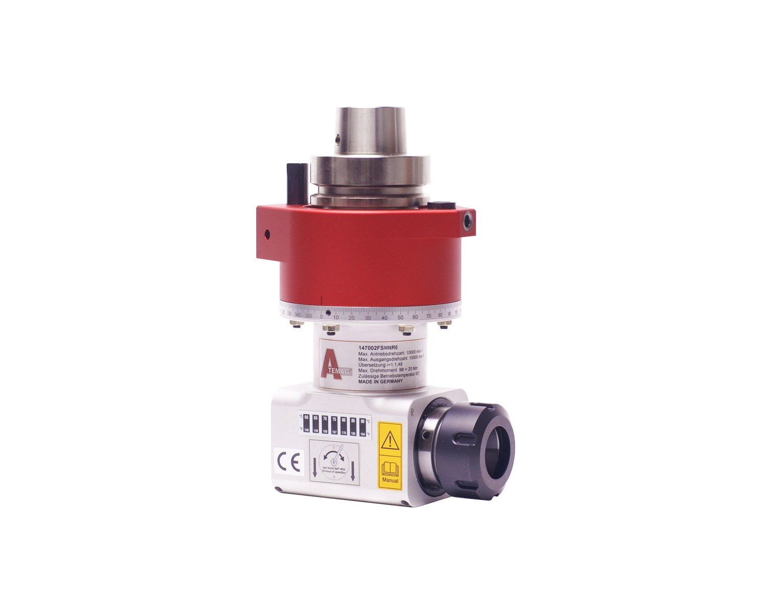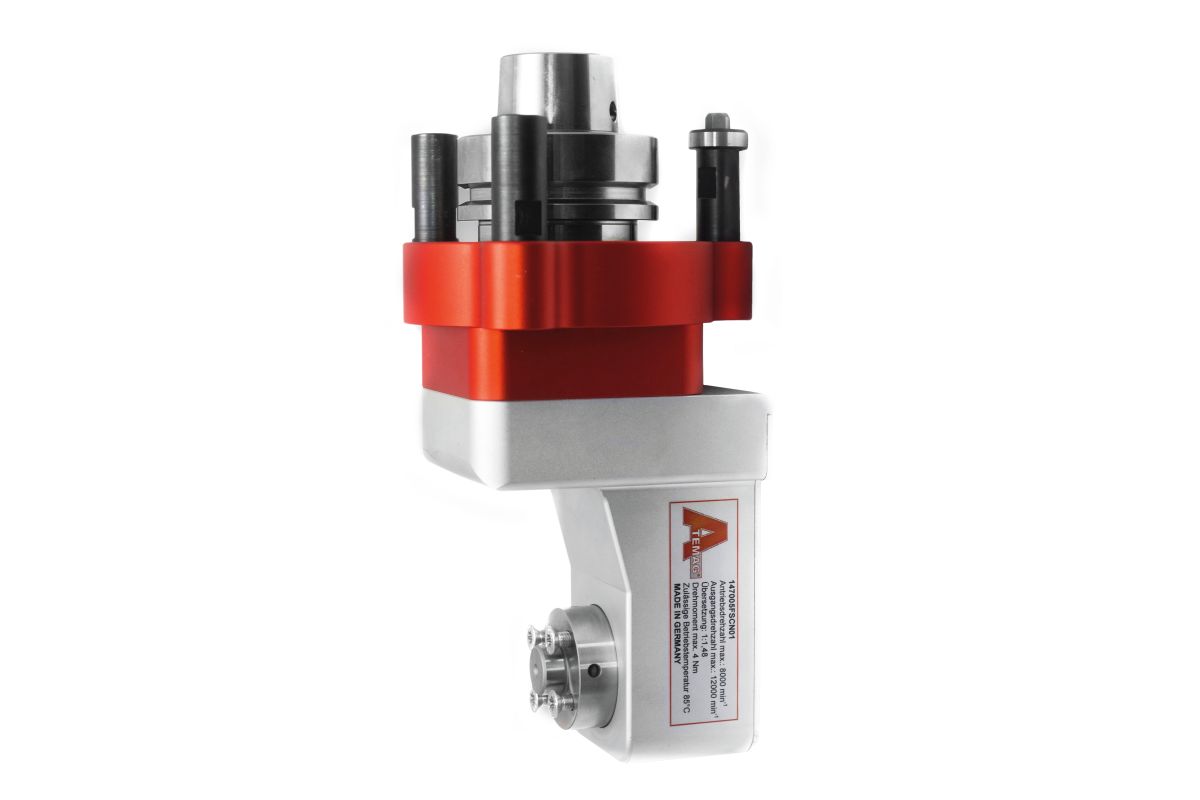 CNC unit for boring, routing and sawing Brand: Atemag Type: Vario Classic With one tool interface, angle 90° Max. drive speed 10,000 R.P.M. Max. tool spindle speed 15,000 R.P.M Gear ratio i = 1:1,5 Turning direction left/right Torque max. 20 Nm Tool interfaces: ER25, ER 32, saw blade flange 30 mm, sawblade dia. max. 180 mm or modular