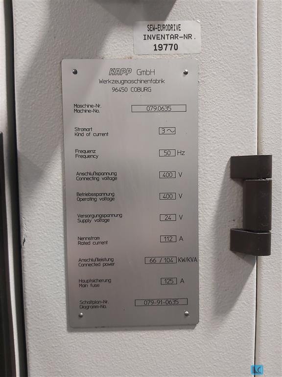 weight of the machine ca.:24 tdimensions of the machine ca.:3900 x 3500 x 2500 m-the machine has no B axis -two grinding spindles with one grinding wheel each -The transport instructions can be found in the documentation (attachment). including Hoffmann KSM filter system Loading list availableOperating data v. 03/27/2023: Operating time: 21727 h / production time: 11960 h Machine documentation: 1 set of circuit diagrams, electrical plans, operating instructionsAccessories: 2 replacement measuring heads Marposs S/500; prism supports Other: Hoffmann KSM filter system Machine condition: according to age, due to processing with emulsion