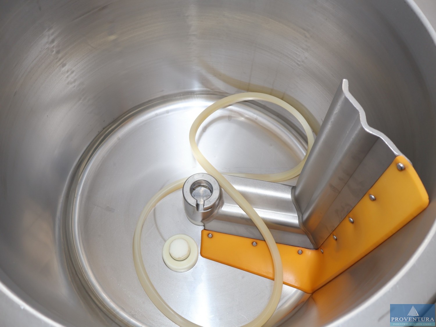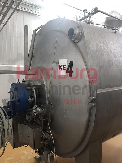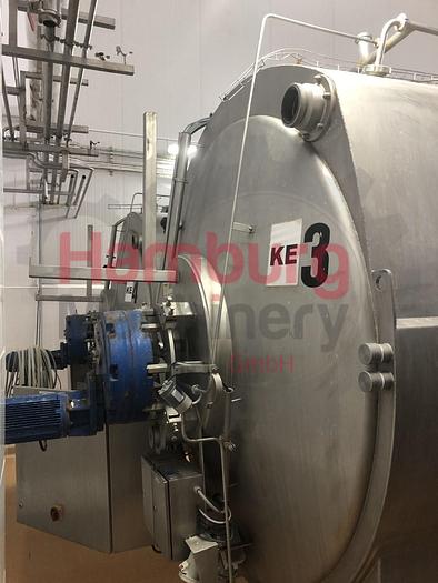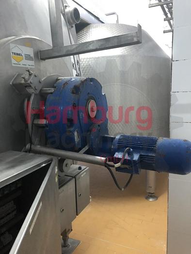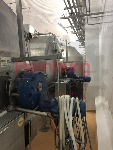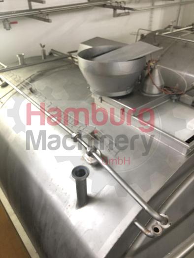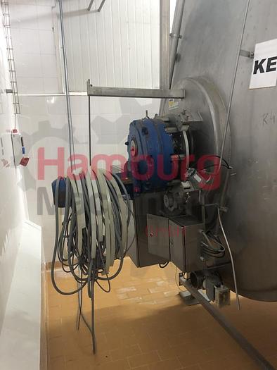 Tebel OST-IV Closed cheese vat of 8.000 ltr. Double jacketed for injection of steam or hot water so the temperature of the milk inside the vat can be indirectly adjusted. Stirring, cutting tools, welded to a horizontal shaft. This is driven by a drive unit with frequency converter. During cutting the tools rotate in the opposite direction as during stirring. The coagulum is cut by sharp radial knives of stainless steel. Whey can be drawn off through a perforated pipe (whey suction device). This pipe is lowered into the whey until it is only just immersed. The curd is discharged through the bottom valve. The vat is inclined (4%) toward the bottom valve to facilitate emptying. After a production run the vat is cleaned by four rotating CIP nozzles located in the top. All parts are made of stainless steel AISI 304 except the drive unit. Stainless steel MCC panel at the backside, close to the ...