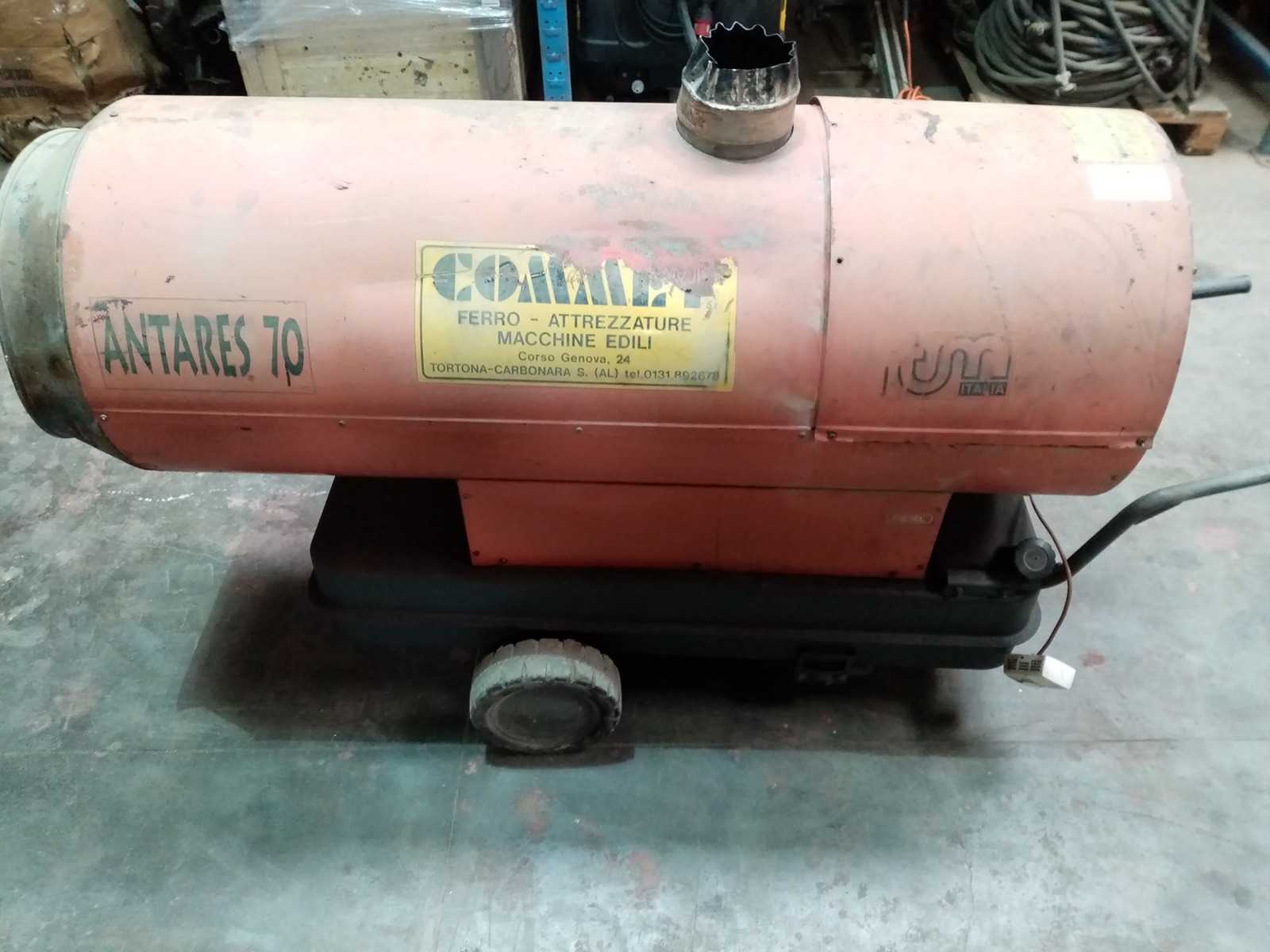 ITM Antares 70 – Calentador diésel Datos generales: Fabricante: ITM Modelo: Antares 70 Número de serie: 04115096 Año de fabricación: 2004 Potencia: 68,8 kW (59.170 kcal/h) Peso: aprox. 120 kg Dimensiones (L x Anor x Ar): aprox. 1800 x 700 x 1100 mm Estado: No probado Descripción: Calefactor diésel ITM Antares 70 diseñado para aplicaciones de calefacción industrial. La unidad proporciona una alta capacidad calefactora y es adecuada para su uso en talleres, almacenes y grandes espacios que requieren una generación eficiente de calor. Auction-ID: A7-45351-40