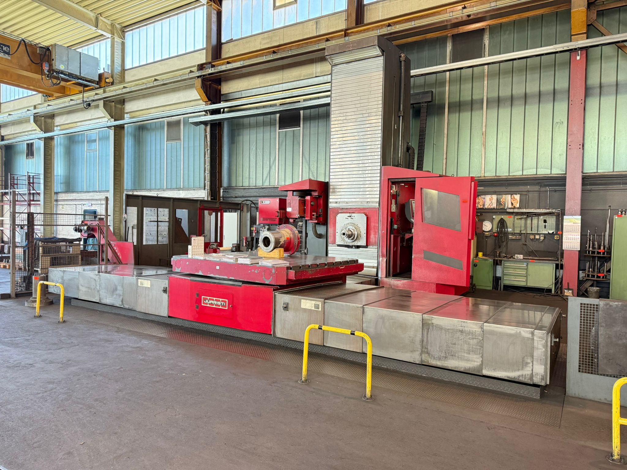 spindle diameter: 205 mm x-travel: 10000 mm y-travel: 2500 mm w-axis: 500 mm spindle travel: 1250 mm Control: Heidenhain type: TNC 355 spindle taper ISO: 50 transmission ratio: 2 feed - independent: 0-3000 mm spindle motor: 37 kW total power requirement: 70 kW weight of the machine ca.: t dimensions of the machine ca.: 14,1x3,2x5,6 m optionally with plate field The tech. Data are manufacturer or operator information and therefore non- binding. We reserve the right to prior sale, Our terms and conditions of sale apply exclusively. About us More than 400 of our own machines in stock Over 15,000 m² of storage space, 70 t crane capacity More than 10,000 items and accessories for your workshop If you are interested in selling machines, production lines, or your business, please contact us. You can find further offers on our website. Tours are possible by appointment. We look forward to you ...