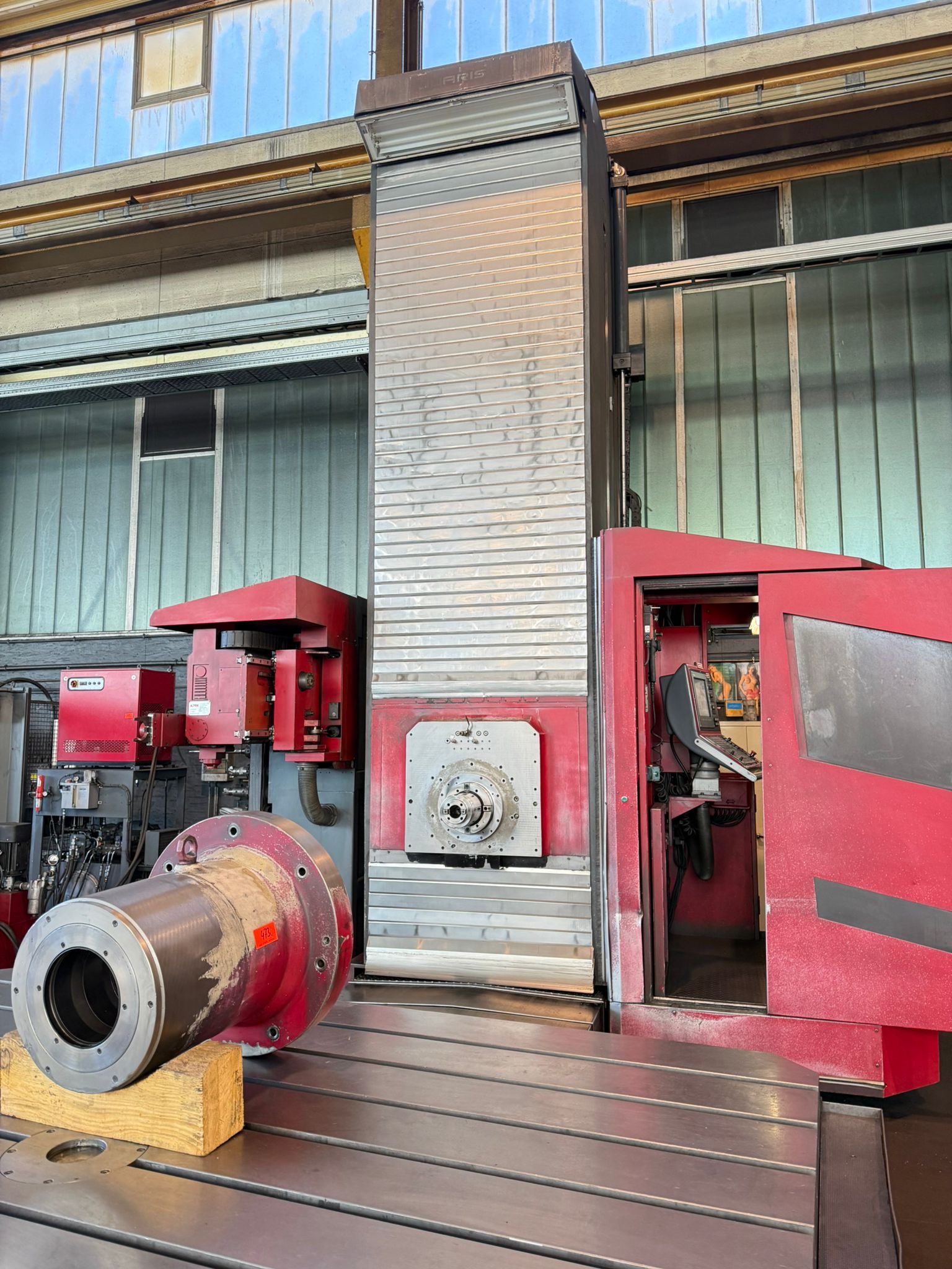 JUARISTI MDR 205 - Mandrinadora de placas CNC Año de construcción : 1992 Revisión eléctrica y electrónica: 2024 Husillo : 205 mm ( Ø ) ISO 50 X : 8.000 mm Y : 3.000 mm W : 1.250 mm ( husillo ) Z : 500 mm (torre) Z1 : 2.000 mm (mesa) Mesa giratoria CNC : 3.000 x 2000 mm – 30 T Velocidad del husillo : 900 rpm Motor del husillo : 34 kW Potencia total : 74 kW Peso de la máquina : 100 T (aprox.) Control : FAGOR 8055 Cabezal de traslación angular Placa base : 2.060 mm x 3.210 mm (3 piezas) Transportador