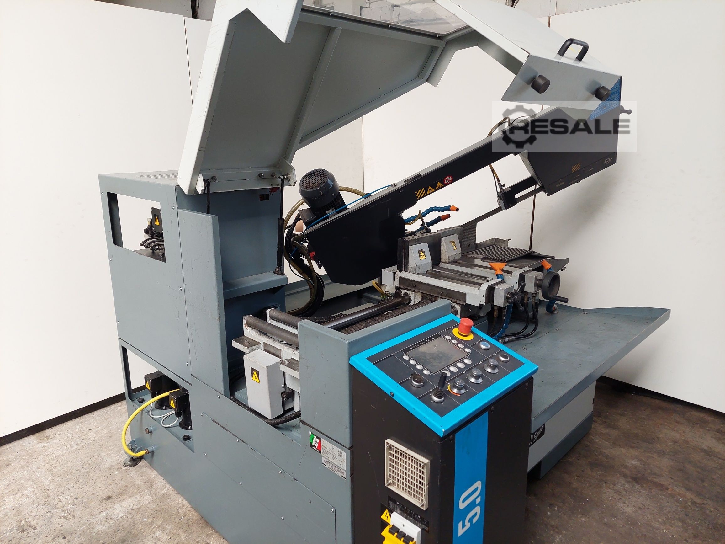 Características técnicas: Hidra. Subir y bajar el brazo de la sierra Diámetro de corte redondo de acero 90: máx. 600 milímetros Diámetro de corte de acero cuadrado 90: máx. 1000 x 600 mm Diámetro de corte redondo de acero 45: máx. 600 milímetros Diámetro de corte de acero cuadrado 45: máx. 600 x 600 mm Diámetro de corte redondo de acero 60: máx. 400 milímetros Diámetro de corte de acero cuadrado 60: máx. 400 x 600 mm Longitud de la hoja de sierra: 9100 x 54 x 1,6 mm Velocidad de corte: 14 - 74 m/min. Control CNC: CEB modelo Mozart Potencia del motor: 10,5 kW Marcado CE Dimensiones (largo x ancho x alto ): aprox. 2300 x 4600 x 3350 mm Peso: aprox. 5,5 toneladas El vendedor no se hace responsable de los errores tipográficos o de transmisión de datos. La máquina es apropiada para su edad en términos de apariencia, tecnología y desgaste; Las ...