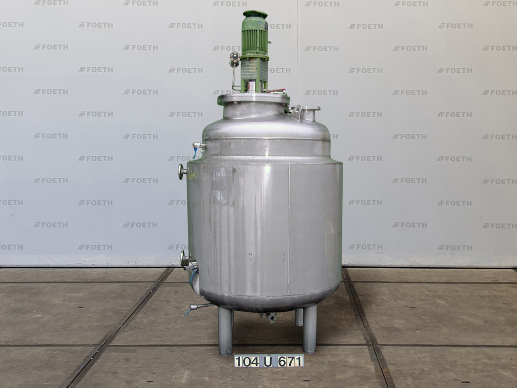 General SKU345S686 MakeAlois Binderberger Albi (AT) No.1248 Year of construction1994 LocationBarneveld Pressure Working pressure3.2 Bar Vacuum possiblecheck Working pressure jacket9 Bar Main Features MaterialStainless steel Volume6300 Ltr. Motor15 KW Specified Features - Stainless Steel Reactor Reactorcheck Capacity6300 Ltr. (max. 7700 Ltr) Vessel sizesdia. 2000x2000 mm Dished bottomcheck Dished top sidecheck ManholeDN600 Top connectionsDN250, DN200, DN100, DN80, DN50 OutletDN80 Half coil jacketedcheck (200 Ltr.) Max. temperature-30/200 °C With paddle stirrercheck Motor15,0 KW, 400 Volt (EExdeIICT4) Speed mixing shaft62 rpm Stainless Steel Reactors MaterialStainless steel 1.4571 (316Ti) Information ATEX compatiblecheckPlastic & polymersCatalysts & fillersStainless Steel ReactorsSolventsDetergent & surf.Other pharmaceuticsCosmeticsOrganicsLubricants & oleo ...